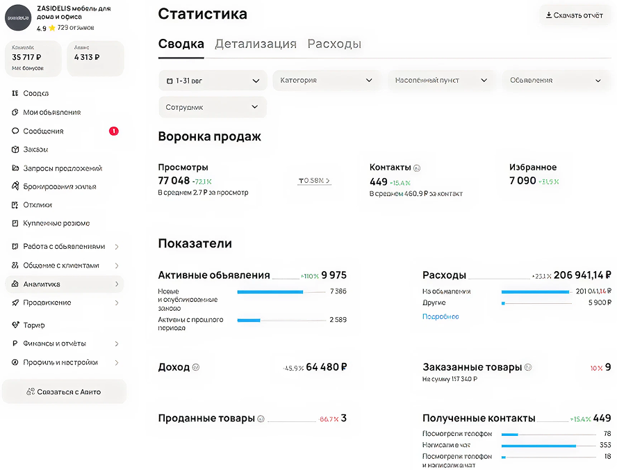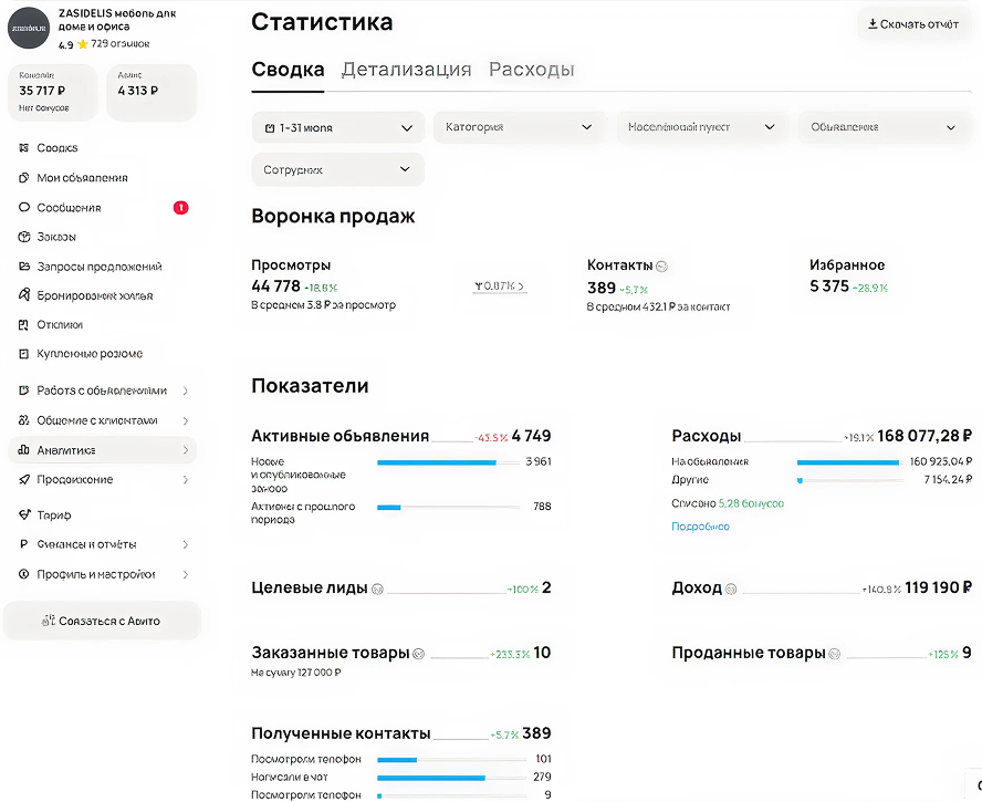 Во второй месяц мы расширили количество объявлений и усилили платное продвижение ключевых категорий. Отдельно протестировали разные варианты цен и комплектов мебели, чтобы увеличить конверсию из просмотра в контакт.